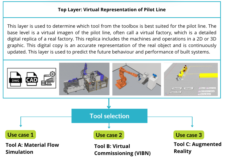 This layer is used to determine which tool from the toolbox is best suited for the pilot line. The base level is a virtual imagen of the pilot line, often call a virtual factory, which is a detailed digital replica of a real factory. This replica includes the machines and operations in a 2D or 3D graphic. This digital copy is an accurate representation of the real object and is continuously updated. This layer is used to predict the future behaviour and performance of built systems.